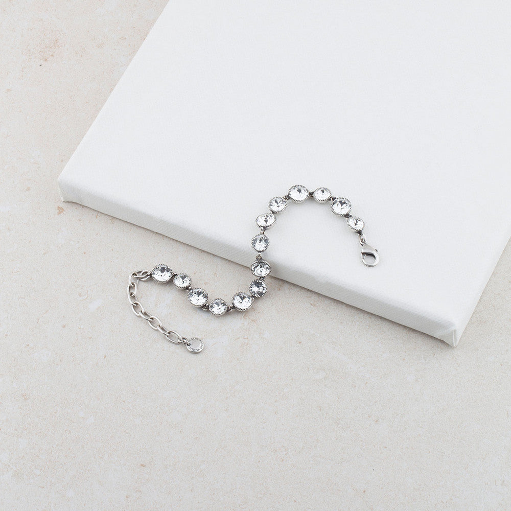 Burnished silver tennis bracelet created with Swarovski® crystals. Length: 19 cm plus extender.