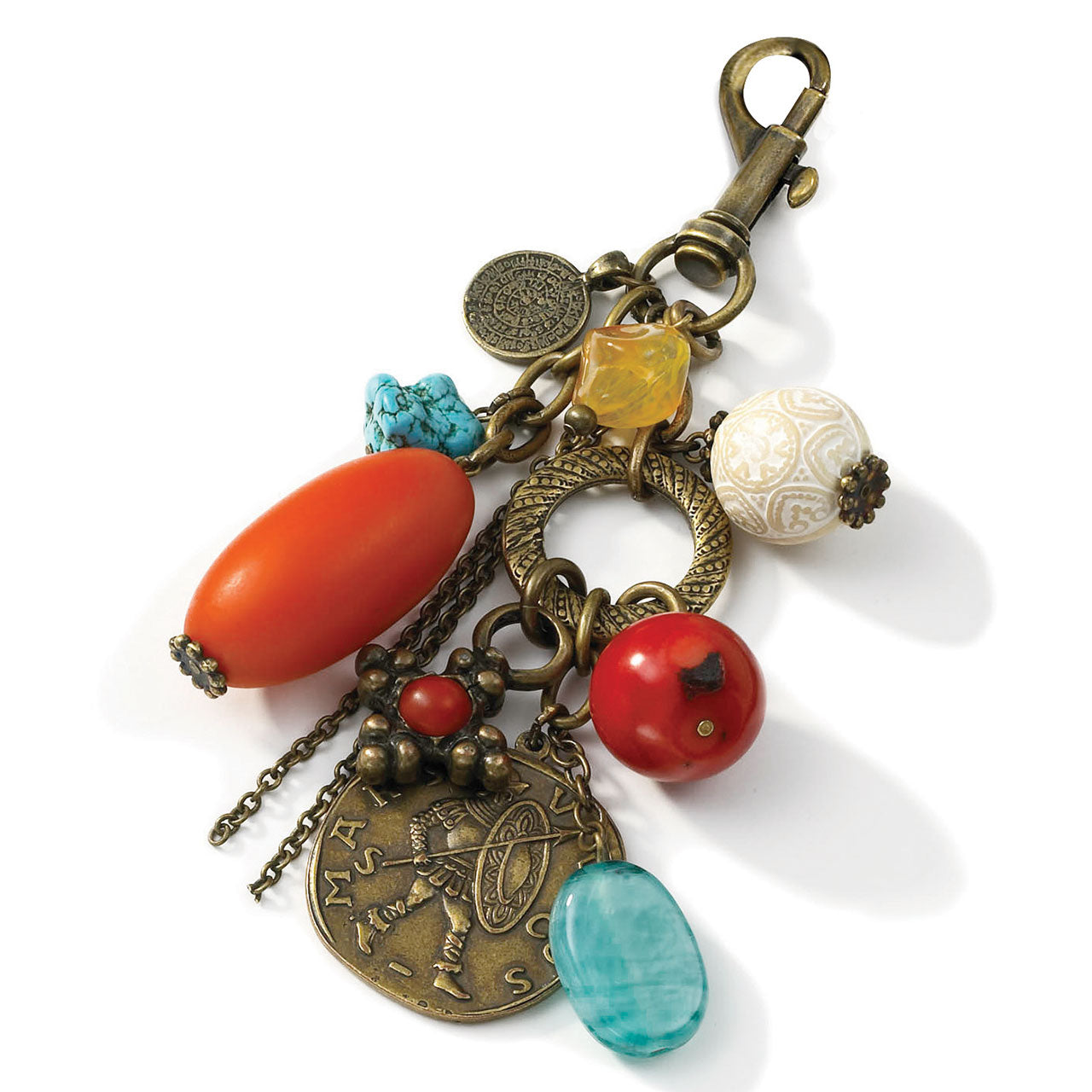 A bold, eclectic charm piece loaded with character — featuring coral, turquoise, honey-yellow and aqua beads, antique-style coins, and rustic metal rings. It has that world-traveller, market-treasure vibe and instantly adds personality to any bag or key set.