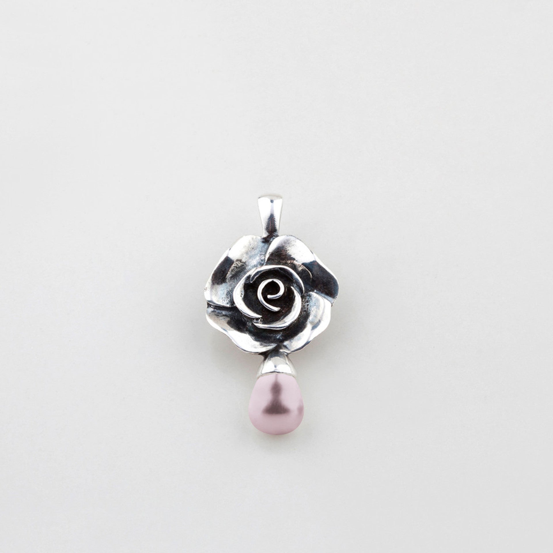 A romantic little statement piece — this pendant features a beautifully sculpted burnished-silver rose, each petal softly curled for that lifelike, vintage-glam feel. Suspended beneath it is a delicate blush-pink teardrop pearl, adding a touch of gentle shimmer and feminine grace. Perfect for dressing up any chain or leather cord with a hint of floral charm.