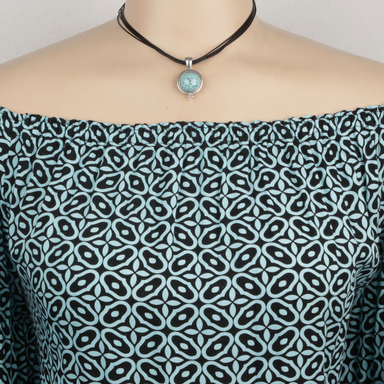 A round silver-toned pendant featuring a dreamy, marbled turquoise stone that instantly pops. It brings that perfect “boho-but-still-polished” feel — a tiny statement that totally steals the spotlight.