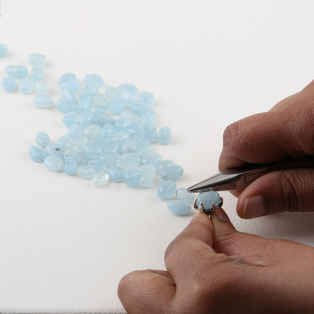 Burnished silver cuff featuring a claw-set semi-precious aquamarine stone. Sizes:S/M. Diameter: S-64 mm;M-67 mm.